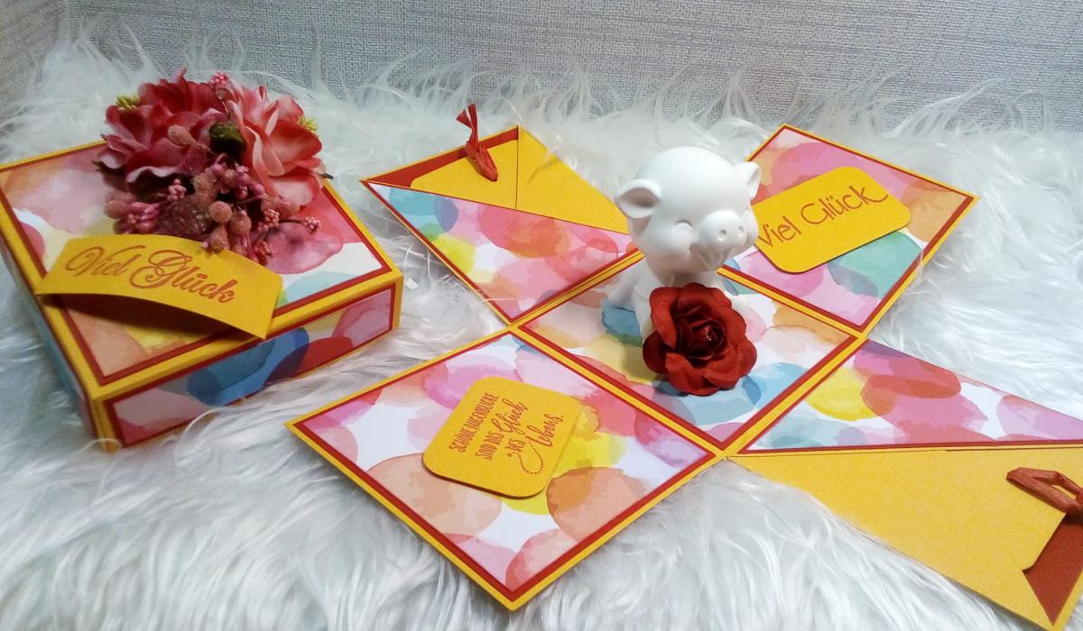 Ob zur Hochzeit oder zur Geburt, eine Explosionsbox ist immer ein tolles Geschenk. Aus Design-Papier und Farbkarton fertigen wir gemeinsam eine Explosionsbox nach Ihren Wünschen an – wie immer ganz gemütlich bei Sekt, Kaffee und Gebäck.